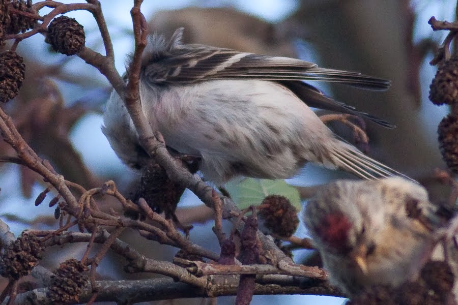 Per G. Henriksen fotograferede lørdag denne sisken i selskab med ca. 50 Nordlige Gråsiskener ved Tangkrogen, Marseliborg. Den nåletynde flankestribning, grundfarven i hoved og på oversiden, det svage rosa skær på undersiden samt stor hvid overgump gør, at jeg mener fuglen er en klokkeklar Hvidsisken. Næbbet er længere end på typiske Hvidsiskener, men de andre karakterer får mig stadig til at holde på, at fuglen må være en Hvidsisken (vel mest sandsynligt en 2K+ han). Det kunne være spændende at høre andres kommentarer vedrørende denne fugl.